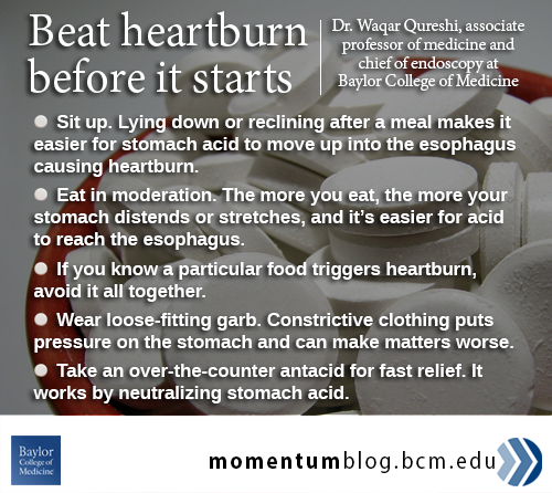 Eating healthier meals during the holidays and cutting back on high-fat foods help prevent heartburn. But if the lure of fried turkey or sweet potatoes is too strong, Baylor College of Medicine associate professor of medicine Dr. Waqar Qureshi has a few tips to stave off a post-meal episode.