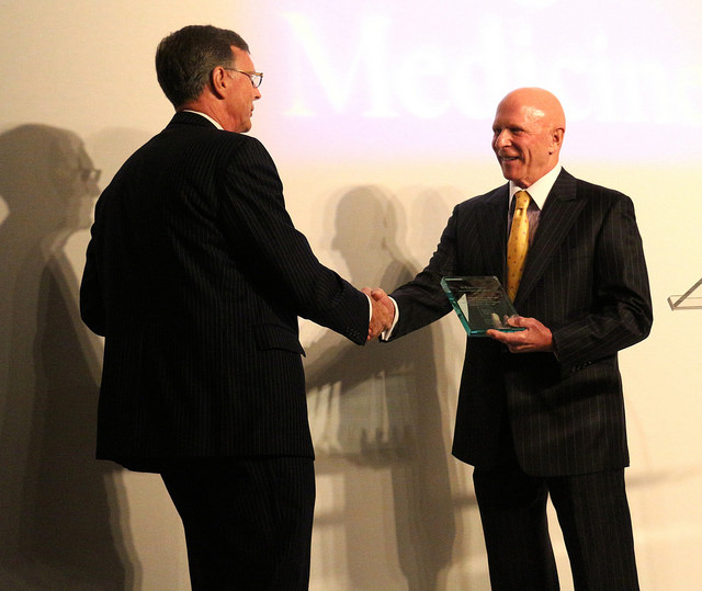 One of Baylor’s most generous supporters, Lester Smith, a Baylor College of Medicine Board of Trustee member whom the breast center is named for, presented Dr. C. Kent Osborne, former director of the Lester and Sue Smith Breast Center and current director of the NCI-designated Dan L. Duncan Cancer Center at Baylor, with a special award – the inaugural C. Kent Osborne Award for Medical Excellence.