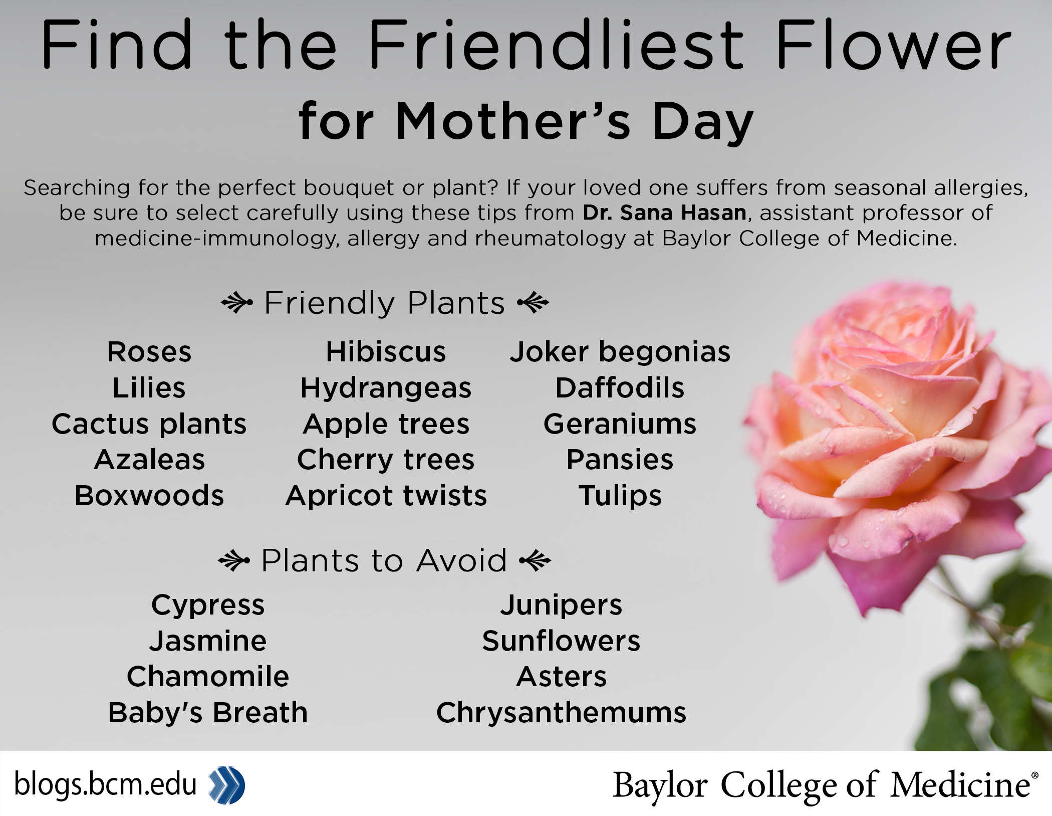 Dr. Sana Hasan, assistant professor of medicine in the section of immunology, allergy and rheumatology at Baylor College of Medicine, has advice for the best flowers and plants to buy for those with seasonal allergies.